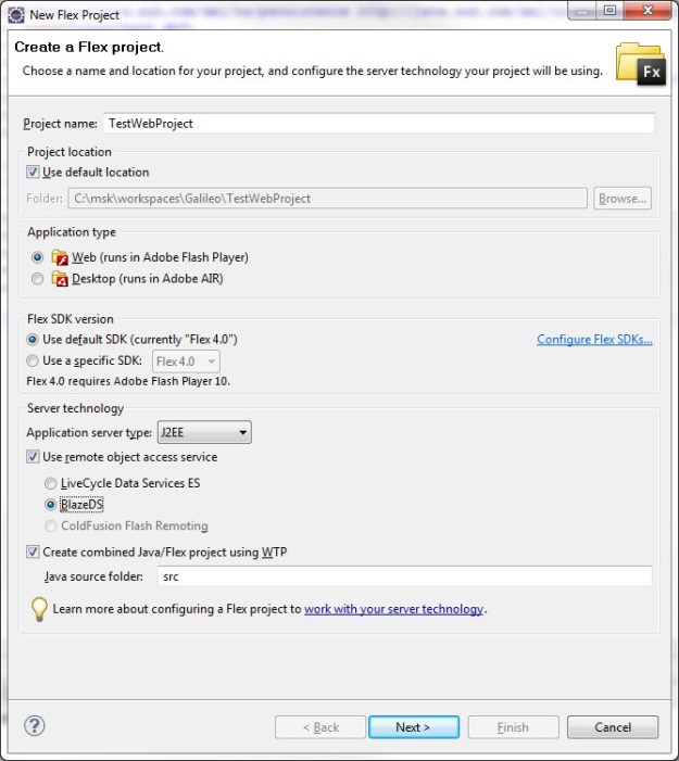 - Now that the installs are done we can make a project… go to the ‘Flash’ perspective and create a new Flex project, fill in the fields something like this: