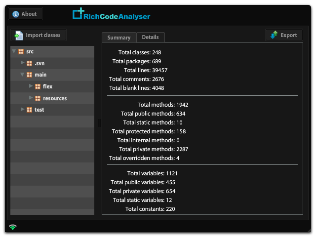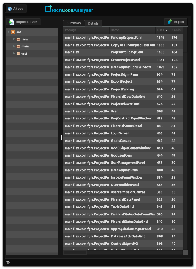 - tried to find some Flex/ActionScript code metrics tools; Flex PMD looks good, but could not install? following command works (just the number of lines in the file).