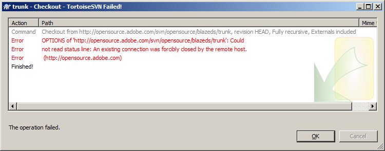- Hmm. Can’t connect to the opensource.adobe.com svn server (http://opensource.adobe.com/wiki/display/blazeds/Source). Trying a new version of tortoiseSvn. Nope still getting the following error: