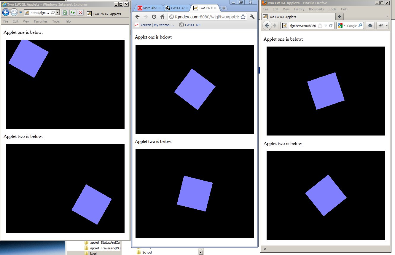 - Running the two applet webpage on fgmdev here: http://fgmdev.com:8080/lwjgl/twoApplets.html. It took one refresh to get everything working in Firefox, but Chrome and IE worked just fine. If you try this in your browser, let me know how it works in the comments section. Focus works too. If you click in the applet, you can move the rotating square with the arrow keys.