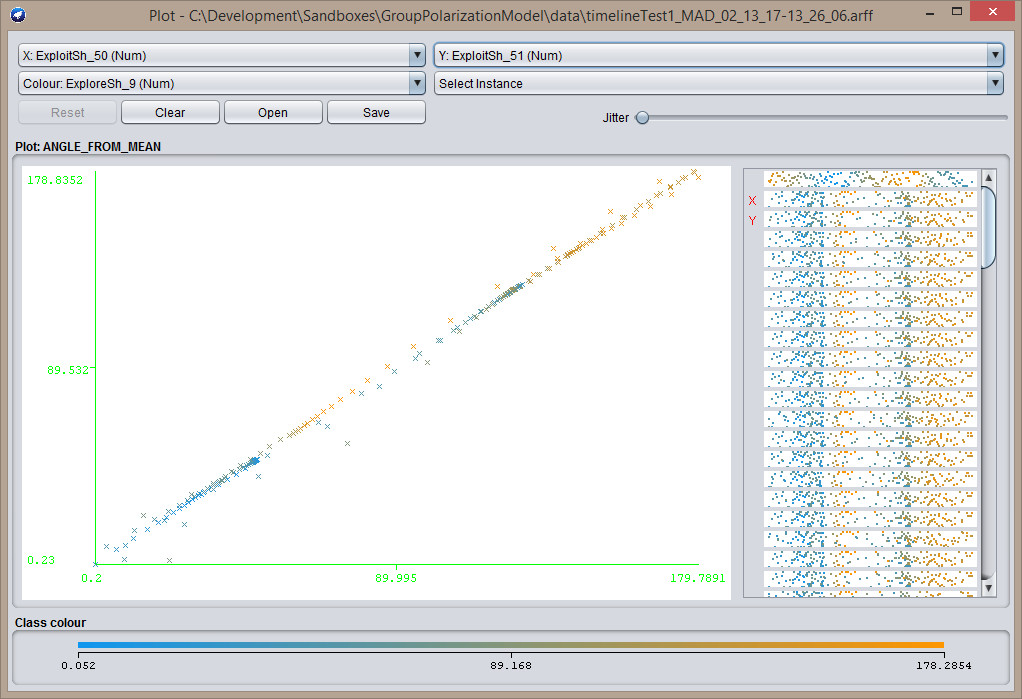 Although I can’t figure out how to classify using this data, clustering works pretty well. This is Canopy (WEKA) on the top dataset above: