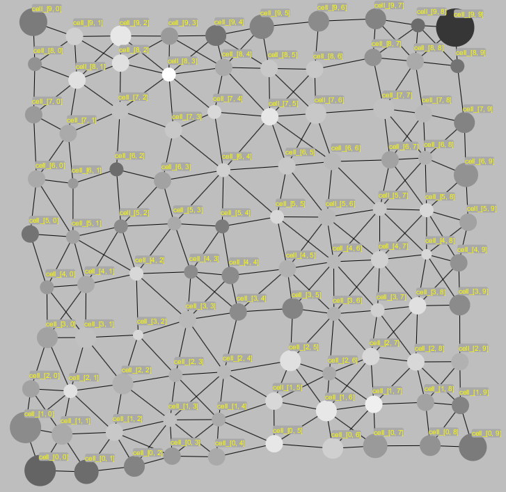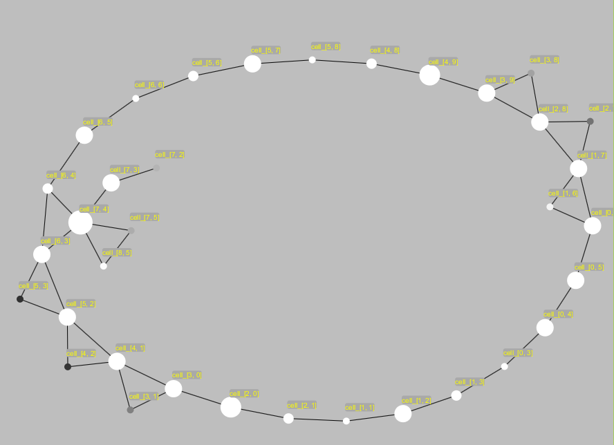 We can see gaps start to appear in the belief space, but the overall grid structure is still visible at the center of the network where the flock spent most of its time. This is also evident in the bright ring of nodes that represents the cells that the flock traversed while it was orbiting the center area. - Stable stampede behavior map: