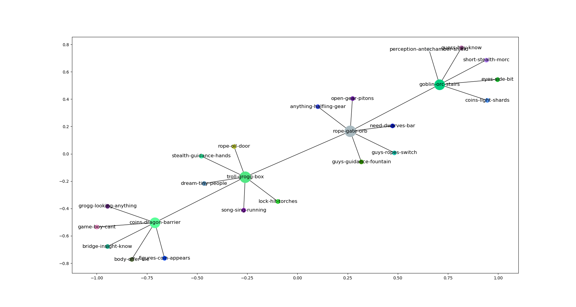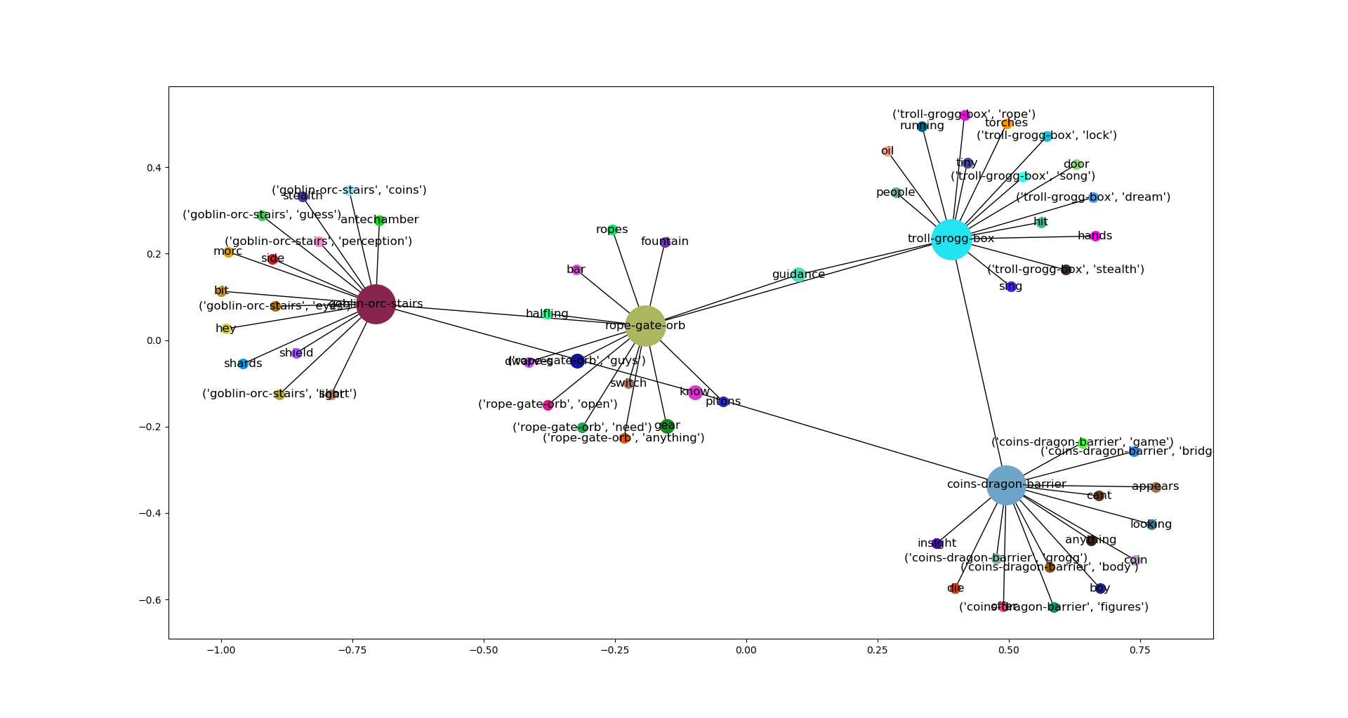 split_1 places: ['goblin', 'orc', 'stairs', 'vines', 'see', 'hit', 'arrow', 'fire', 'gate', 'behind'] splt-chn_1of4-tymora1 spaces: ['guys', 'temple', 'guess', 'damage', 'hey', 'spell', 'axe', 'know', 'trees', 'move', 'come'] splt-chn_1of4-tymora2 spaces: ['short', 'log', 'attack', 'feet', 'stealth', 'damage', 'morc', 'temple', 'axe', 'top', 'mindy'] splt-chn_1of4-tymora3 spaces: ['coins', 'light', 'damage', 'shards', 'glass', 'steps', 'floor', 'need', 'poison', 'bow', 'sacred'] splt-chn_1of4-tymora4 spaces: ['spell', 'glass', 'feet', 'perception', 'antechamber', 'shield', 'cast', 'hand', 'log', 'move', 'beyond'] splt-chn_1of4-Group 1 spaces: ['eyes', 'bow', 'side', 'bit', 'looking', 'carefully', 'halfling', 'arrows', 'near', 'beyond', 'hand'] common elements: set() ------------------------ split_2 places: ['rope', 'gate', 'orb', 'statues', 'across', 'see', 'side', 'around', 'pit', 'feet'] splt-chn_2of4-tymora1 spaces: ['something', 'perception', 'hand', 'statue', 'floor', 'guys', 'ropes', 'switch', 'wall', 'tie', 'pull'] splt-chn_2of4-tymora2 spaces: ['tie', 'wall', 'open', 'lever', 'gear', 'trap', 'hand', 'pitons', 'lightning', 'javelin', 'cross'] splt-chn_2of4-tymora3 spaces: ['lever', 'trap', 'metal', 'need', 'floor', 'perception', 'statue', 'dwarves', 'hand', 'bar', 'large'] splt-chn_2of4-tymora4 spaces: ['trap', 'guys', 'guidance', 'metal', 'statue', 'fountain', 'perception', 'appears', 'investigate', 'spell', 'coins'] splt-chn_2of4-Group 1 spaces: ['anything', 'metal', 'halfling', 'gear', 'close', 'something', 'spell', 'statue', 'range', 'trap', 'hand'] common elements: set() ------------------------ split_3 places: ['troll', 'grogg', 'box', 'chest', 'hand', 'open', 'gate', 'club', 'see', 'want'] splt-chn_3of4-tymora1 spaces: ['rope', 'oil', 'fire', 'door', 'sleep', 'maybe', 'trolls', 'key', 'nice', 'around', 'feet'] splt-chn_3of4-tymora2 spaces: ['dream', 'tiny', 'people', 'sleep', 'groggs', 'thing', 'eyes', 'turn', 'lets', 'need', 'group'] splt-chn_3of4-tymora3 spaces: ['attack', 'damage', 'key', 'fire', 'need', 'lock', 'hit', 'torches', 'attacks', 'dwarves', 'know'] splt-chn_3of4-tymora4 spaces: ['spell', 'stealth', 'guidance', 'sleep', 'hands', 'burning', 'cast', 'ready', 'attack', 'damage', 'key'] splt-chn_3of4-Group 1 spaces: ['song', 'sing', 'trolls', 'running', 'feather', 'sleeping', 'looking', 'need', 'creature', 'come', 'face'] common elements: set() ------------------------ split_4 places: ['coins', 'dragon', 'barrier', 'platform', 'something', 'light', 'woman', 'see', 'eyes', 'treasure'] splt-chn_4of4-tymora1 spaces: ['blue', 'figures', 'enormous', 'coin', 'piles', 'appears', 'friend', 'around', 'full', 'wyrm', 'shall'] splt-chn_4of4-tymora2 spaces: ['body', 'enormous', 'across', 'must', 'offer', 'mortal', 'gold', 'piles', 'die', 'near', 'within'] splt-chn_4of4-tymora3 spaces: ['bridge', 'choose', 'insight', 'blue', 'know', 'gold', 'bridges', 'appears', 'die', 'enormous', 'game'] splt-chn_4of4-tymora4 spaces: ['stay', 'across', 'must', 'dragons', 'game', 'boy', 'enormous', 'gold', 'piles', 'cant', 'hear'] splt-chn_4of4-Group 1 spaces: ['grogg', 'looking', 'anything', 'thing', 'troll', 'dragons', 'moment', 'gate', 'gold', 'breath', 'magical'] common elements: set()