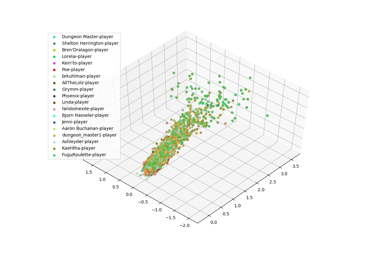 ---------------------- FuguRoulette-player: post TF-IDF javelin: 1.3235824005932413 orc: 1.2596337832554234 don: 1.2329356851106978 mindy: 1.1935877563453061 dragon: 1.180695872064165 room: 1.16758789676671 goblin: 1.1244271157713812 gate: 1.0518778198496626 muttered: 0.9602704217082824 orb: 0.7818369426232508 vines: 0.7682713289173773 around: 0.7650741399517217 believe: 0.7181160263645541 set: 0.6960723252519683 ---------------------- Kaeritha-player: post TF-IDF troll: 1.8877816896391235 room: 1.6145159552006425 spell: 1.19387373804735 orb: 1.031131725198719 hand: 1.0226191383574903 halfling: 0.882770501608177 feather: 0.8321564150194518 chest: 0.7956715550842 need: 0.7833254070966856 without: 0.7774257667568547 thought: 0.7698168337310007 wasn: 0.7681132279117597 grogg: 0.7397095370527041 nodded: 0.7283692418929164 cricket: 0.7152753845274986 ---------------------- Ashleyder-player: post TF-IDF room: 1.37664885493529 halfling: 1.3095258648568422 orb: 1.1635393833341 arrow: 1.0958743699311024 bow: 1.0833323871838676 woman: 0.905661830111989 sword: 0.8274886204621582 side: 0.8159855961191507 door: 0.8030328480633289 weapons: 0.8023256227742956 bit: 0.7654054685520582 armor: 0.6925203949859854 compatriots: 0.6877982251257945 moment: 0.666106887452693 ready: 0.6591955622573524 wasn: 0.6407825783880001 group: 0.6181005287618395 words: 0.6162132133458346 statues: 0.6129058701485565 ---------------------- dungeon_master1-player: post TF-IDF grogg: 5.334199523123002 room: 3.811509447108922 gate: 3.258183021914178 orb: 2.618164708893951 troll: 2.613186928575063 arrow: 2.324879853387413 looking: 2.0945608918805405 dragon: 2.0386853821484214 statues: 2.0307941282615394 halfling: 1.9946267677568987 goblin: 1.9479046173471883 eyes: 1.9250729565572604 large: 1.8740265406115013 hand: 1.8621985701316857 ooc: 1.854167610118333 orc: 1.8453651951258079 ---------------------- Aaron Buchanan-player: post TF-IDF smile: 5.028089150947501 troll: 4.349229589605341 linda: 4.01623419920215 damage: 3.5816072459387898 let: 3.145522725372224 know: 3.0568701804539486 jenni: 3.0150241755107605 need: 2.9865597817204916 don: 2.89736685000583 fire: 2.8533063572331154 hit: 2.750325190292788 elf: 2.61638151392588 nothing: 2.5832965974665827 rope: 2.5651899037822403 want: 2.5516172618521207 room: 2.5234046485126127 hand: 2.408589994530533 key: 2.400913929253641 halfling: 2.300372097141645 grogg: 2.2976898742276277 ---------------------- Jenni-player: post TF-IDF insight: 3.5333368131417924 troll: 3.4738014944618905 help: 2.629726435567097 grogg: 2.396996336469604 need: 2.358944535917952 room: 2.25768912386651 healing: 2.2382624097615995 rolls: 2.2229326490531314 gate: 2.195439698041948 around: 2.161868029714761 flame: 2.132641891485049 perception: 2.1149040159363293 floor: 2.1054598538974045 hands: 1.9310855224062018 light: 1.8784320905937355 uses: 1.850257078968512 catch: 1.793277658871867 ---------------------- Bjorn Hasseler-player: post TF-IDF flame: 2.315315586844817 sacred: 2.315315586844817 stonecunning: 2.1557147060826947 rolls: 2.132883047459771 grogg: 1.9660626127710805 don: 1.9424906312537291 steps: 1.935482241603244 bridge: 1.7092785394164918 rope: 1.5744166673302291 torches: 1.551554596214274 stairs: 1.4732750153279608 platform: 1.3689503773093064 vines: 1.3351891642736244 light: 1.3217202403569526 ---------------------- randomexile-player: post TF-IDF troll: 5.780387270246775 grogg: 4.59954530049338 need: 4.379175783748707 attack: 3.7429397050152247 don: 3.564218421074024 open: 3.503242156009218 gate: 3.3068573706012985 stealth: 3.1899559813180645 traps: 2.965951521209904 chest: 2.9426150667239175 side: 2.8272991421295277 room: 2.8187225708944883 dragon: 2.7919898167411095 party: 2.784297298562819 know: 2.698287503059542 ---------------------- Linda-player: post TF-IDF grogg: 10.15480371661793 damage: 6.745957190399183 gate: 4.595526542550383 turn: 4.47763106887882 side: 4.220054751334396 room: 4.0759304935283875 troll: 3.6496283755351433 persuasion: 3.427787051079431 stairs: 3.2452878097049718 open: 3.0691978408049714 appears: 2.9662151644031236 barrier: 2.9526976397873197 hit: 2.882801312489094 please: 2.756473252393314 feet: 2.7553337830423685 ---------------------- Grymm-player: post TF-IDF rope: 2.5925740290266477 troll: 2.149767946611558 grogg: 2.1373623910153023 close: 2.093606121380299 goes: 1.9114083131138986 thing: 1.879425660287383 gate: 1.8498993377390152 behind: 1.7759591324283694 around: 1.7739744768952832 eyes: 1.6015525983573213 along: 1.565130385605012 face: 1.5465277621378841 merric: 1.531838768719999 goblin: 1.5017357357398398 chest: 1.4793322265307385 ---------------------- AllTheLolz-player: post TF-IDF rope: 2.5574727497157186 bit: 2.334695846271241 halfling: 2.2917865866720875 turn: 2.2913671375617244 help: 2.263326099701241 want: 2.255517431033907 let: 2.2248419816867973 hand: 2.05823145874274 thing: 2.0252535914010243 need: 2.017853031957051 trying: 1.9392838304479607 won: 1.9074029011042937 lever: 1.8940047810992084 motions: 1.8791666280630153 grogg: 1.8512620533629853 know: 1.8460073095362568 ---------------------- brkuhlman-player: post TF-IDF joy: 2.2090099096592093 bow: 1.4708821850714477 comrades: 1.3450198066079633 agreed: 1.2909672047219294 shit: 1.2511351948636689 hand: 1.1939893091569087 simply: 1.0754065506075219 alongside: 1.03095098597318 ready: 1.030909228527731 moves: 1.0217451884953292 follows: 1.019308558744064 esvele: 1.0031051305561383 eyes: 1.0031051305561383 alrighty: 1.0 sounds: 1.0 wow: 1.0 armor: 0.9675296552629622 goblin: 0.9675296552629622 arrow: 0.959551586099932 ---------------------- Poe-player: post TF-IDF grogg: 9.574956839446978 room: 7.7929146794417985 gate: 7.769157727681967 open: 5.161416388301517 side: 4.9552473292407315 hand: 4.920538249739186 something: 4.862660052617354 troll: 4.756897094197843 damage: 4.698981284560832 phoenix: 4.506875041306749 group: 4.4419312361884575 stealth: 4.347602688687722 bee: 4.337563548710324 stairs: 4.27283782404158