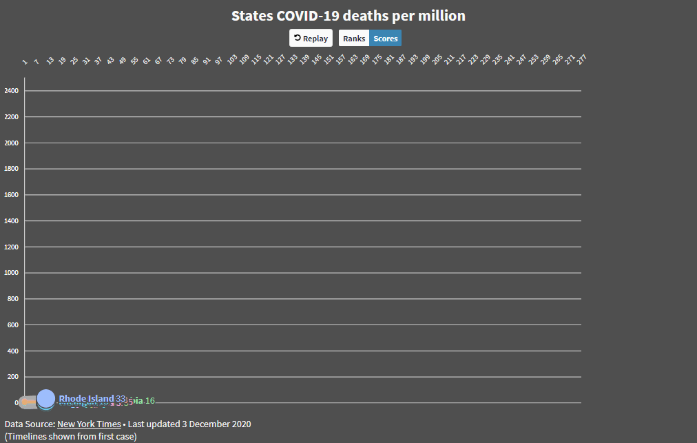 The hard-hit eastern states still look a lot like the parts of Europe that are still on top of the spread. Georgia, Mississippi, and the Dakotas look very bad. Washington and California, which were hit early, are still experiencing very low rates. I guess we’ll see how this chart looks in January. If there is a Thanksgiving-related surge, we should see it by then.