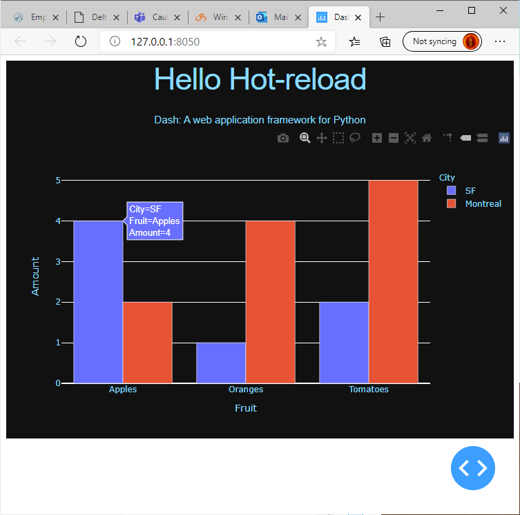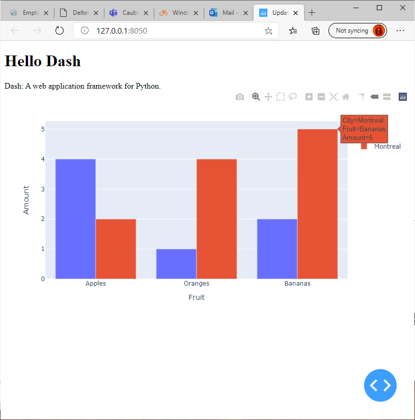 - Got dash running, which set up a server for your interactive graphs. Not really sure which one is better, though I’m guessing that data can be live inside dash graphs. I don’t think this will matter too much with the embedding charts, but it’s good to know