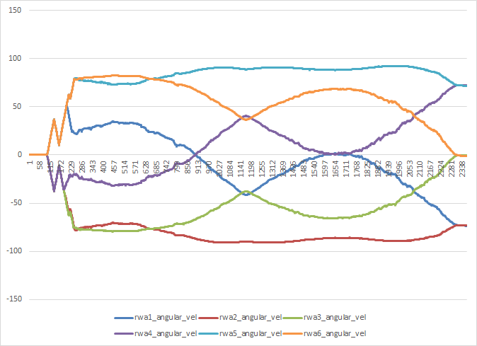 - Here’s the reaction wheel angular velocity. It’s a bit rough looking, which is curious, but I’m guessing that it has to do with clamping issues that I need to fix: