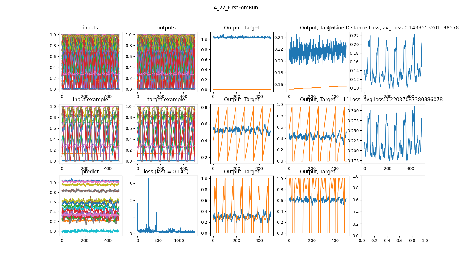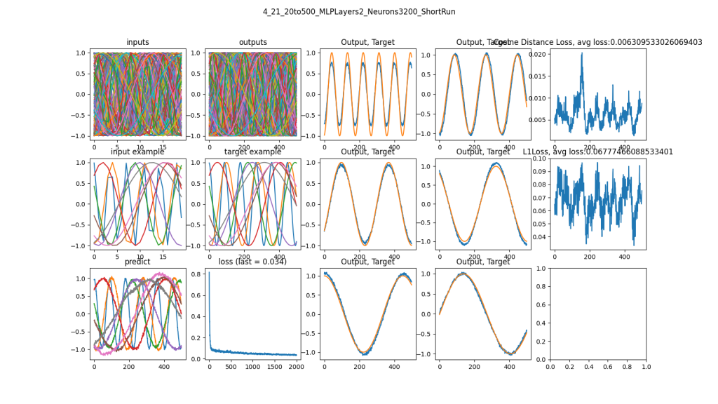 It turns out that the frequency problem was actually a visualization bug! Here’s an example going from 20 input vectors to 500 output vectors using attention and 2 3,000 perceptron layers: