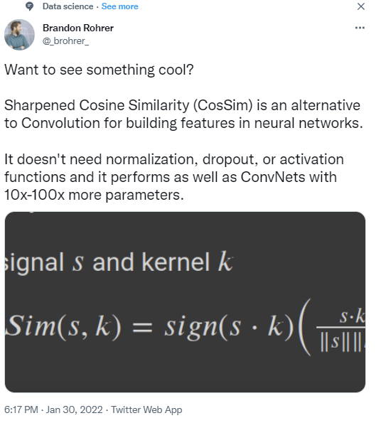 Sharpened Cosine Similarity (CosSim) is an alternative to Convolution for building features in neural networks. It performs as well as ConvNets with 10x-100x more parameters.