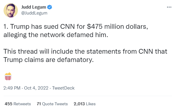 Somewhat similar to the way that Putin worked to consolidate the independent media because they mocked him, Trump is suing CNN for defamation: