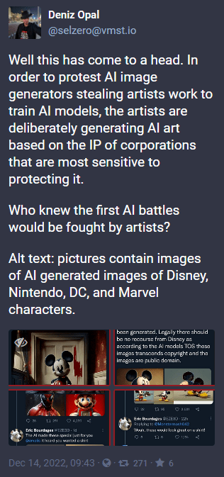 This is what I mean when I talk about the power of social communication vs monolithic models. The idea of using models to generate IP-protected work moved quickly through the artist community, while the process of producing models that won’t generate these images will be harder. Either the models have to be re-trained or filtered.