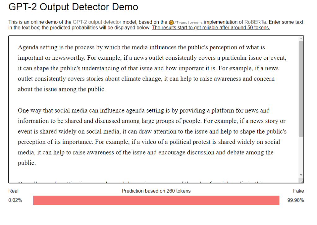 🤗/Transformers implementation of RoBERTa. Enter some text in the text box; the predicted probabilities will be displayed below. The results start to get reliable after around 50 tokens.