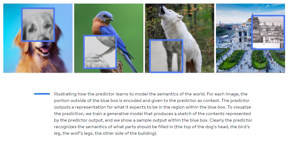 We’re excited to introduce the first AI model based on a key component of LeCun’s vision. This model, the Image Joint Embedding Predictive Architecture (I-JEPA), learns by creating an internal model of the outside world, which compares abstract representations of images (rather than comparing the pixels themselves). I-JEPA delivers strong performance on multiple computer vision tasks, and it’s much more computationally efficient than other widely used computer vision models. The representations learned by I-JEPA can also be used for many different applications without needing extensive fine tuning. For example, we train a 632M parameter visual transformer model using 16 A100 GPUs in under 72 hours, and it achieves state-of-the-art performance for low-shot classification on ImageNet, with only 12 labeled examples per class. Other methods typically take two to 10 times more GPU-hours and achieve worse error rates when trained with the same amount of data.