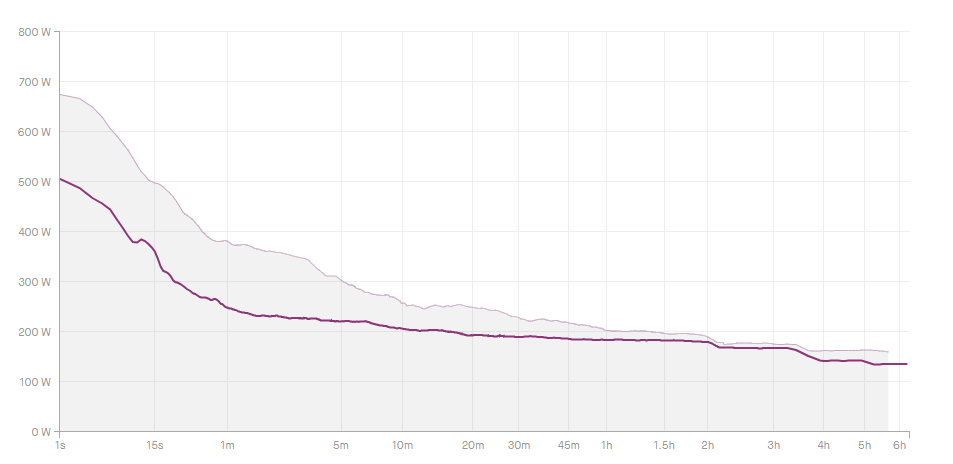 Good ride yesterday. Managed to eke out a 20mph average, but it was hard for the last 30 miles or so. Here’s the power curve: