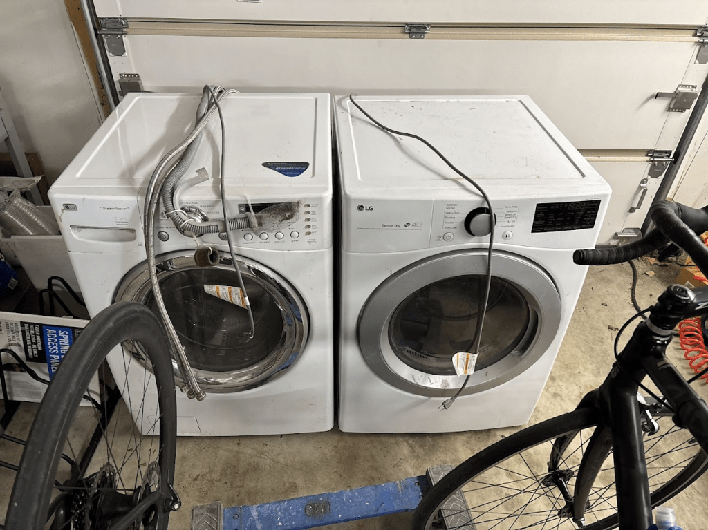 - Drained the washing machine, so hopefully that will help. On the ride today, Ross suggested that I put the machines in the garage. “That’s silly,” I think. “The garage is full of bikes and stuff from the basement!”