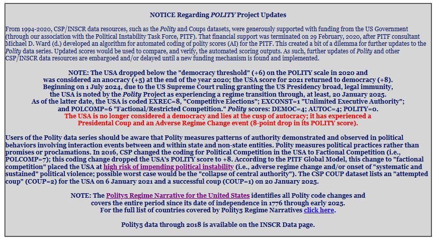 NOTE: The USA dropped below the “democracy threshold” (+6) on the POLITY scale in 2020 and was considered an anocracy (+5) at the end of the year 2020; the USA score for 2021 returned to democracy (+8). Beginning on 1 July 2024, due to the US Supreme Court ruling granting the US Presidency broad, legal immunity, the USA is noted by the Polity Project as experiencing a regime transition through, at least, 20 January 2025. As of the latter date, the USA is coded EXREC=8, “Competitive Elections”; EXCONST=1 “Unlimited Executive Authority”; and POLCOMP=6 “Factional/Restricted Competition.” Polity scores: DEMOC=4; AUTOC=4; POLITY=0.