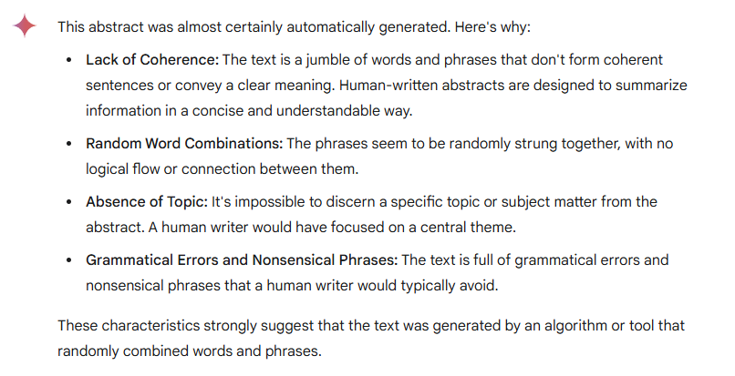 - Running it through Gemini (prompt: “Read the following abstract and say whether it was written by a human or automatically generated:”) gives a good, well justified result: