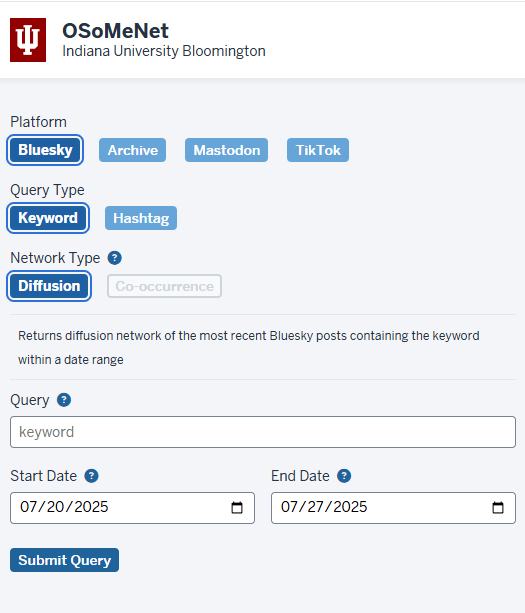 OSoMeNet uses search APIs provided by social media platforms (e.g. Bluesky and Mastodon) to generate diffusion and co-occurrence networks. The networks are visualized using Helios Web. Helios Web is a web-based library developed by Filipi Nascimento Silva.