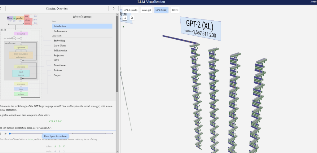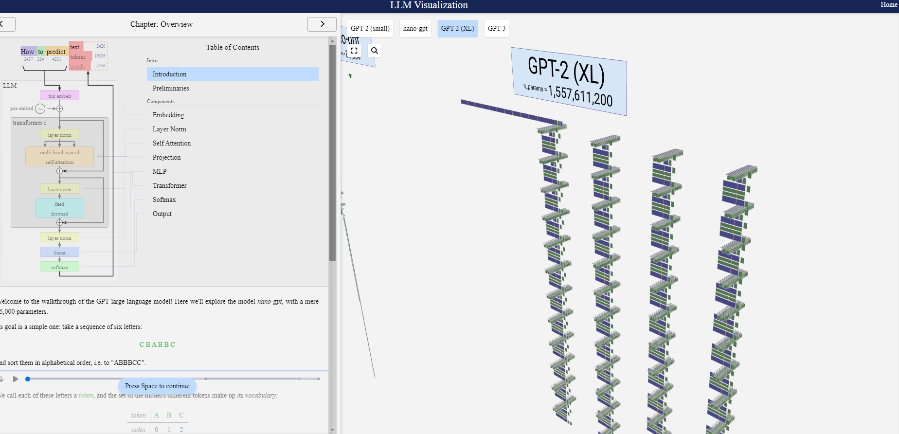 A visualization and walkthrough of the LLM algorithm that backs OpenAI’s ChatGPT. Explore the algorithm down to every add & multiply, seeing the whole process in action.