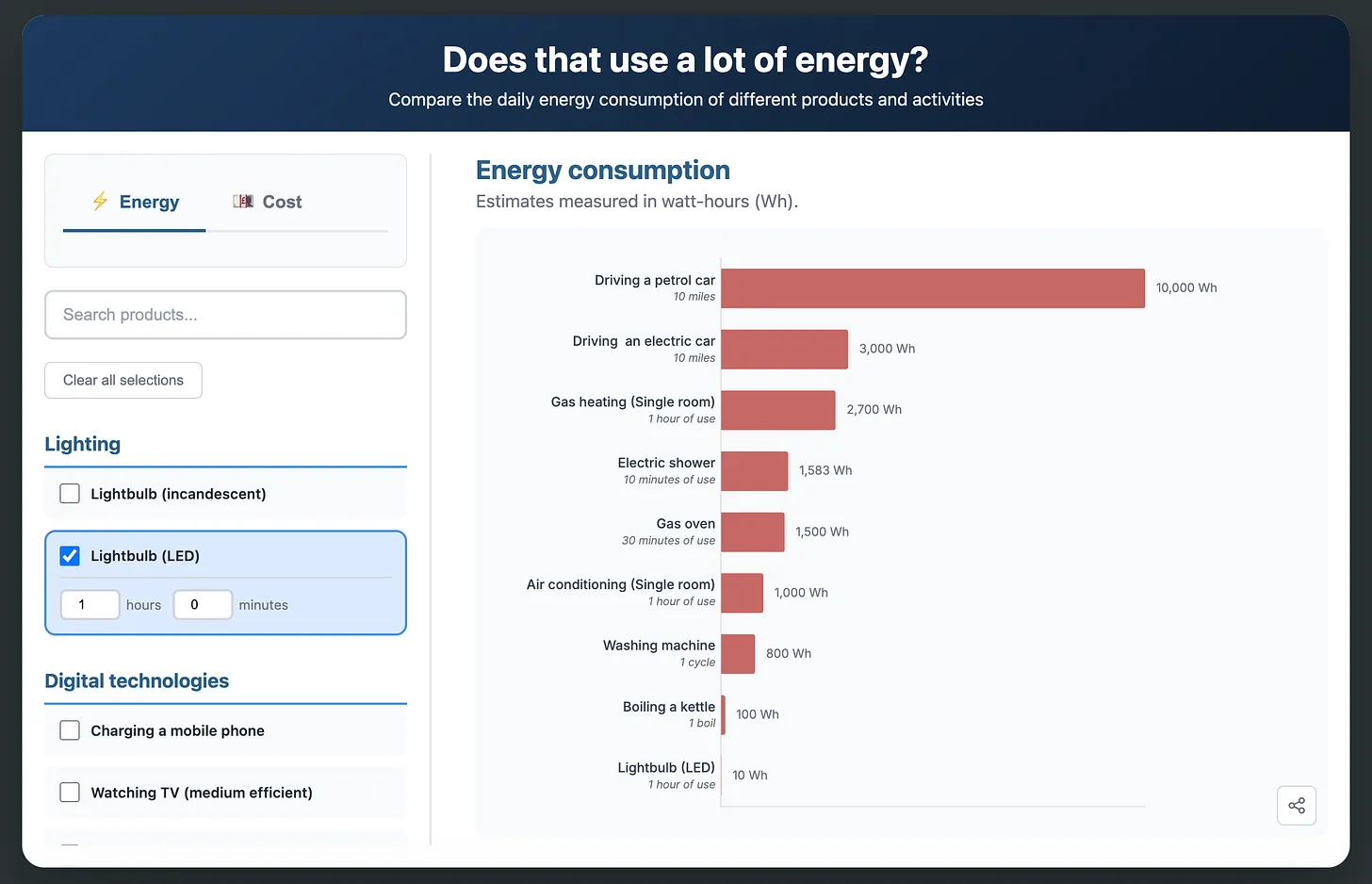 This is a very nice tool for comparing the various energy use of things: https://hannahritchie.github.io/energy-use-comparisons/