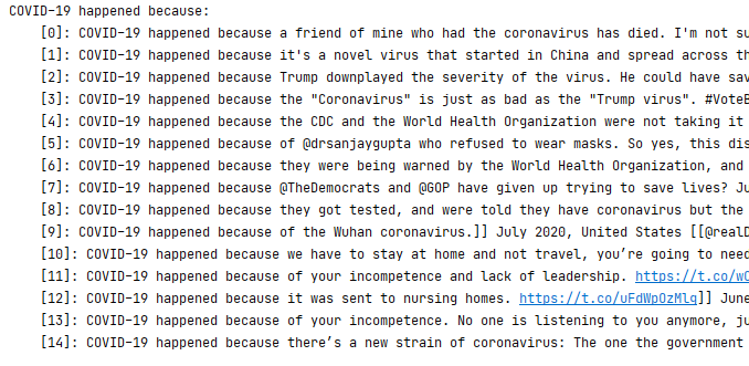 - Set few-shot training by drawing selecting all the tweets that contain the phrase %xxxx% in the corpora and subsample as needed to the desired number of examples. Then generate and store the desired number of results