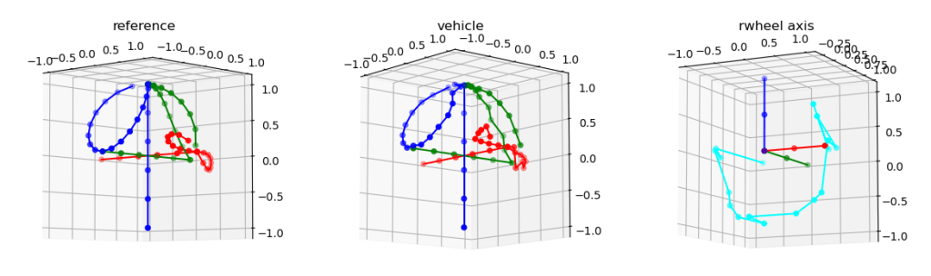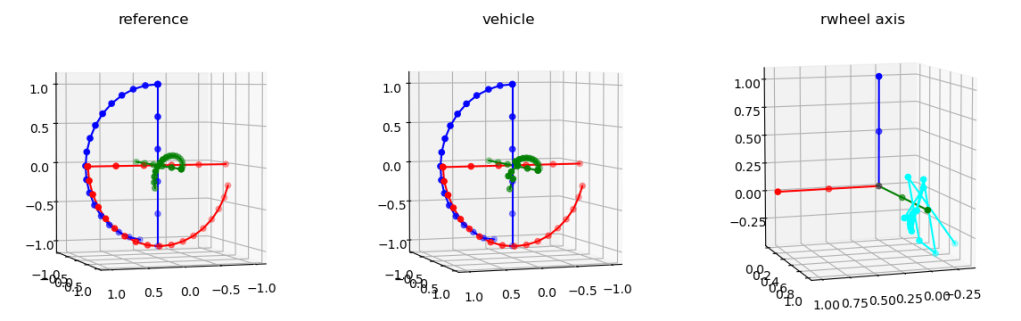 So that’s done, and it’s not as smooth as it should be. Here’s the reference frame rotated through 180 degrees on the left, the matching rotation in the middle, and the simplified reaction wheels with the rotation axis (cyan) on the right: