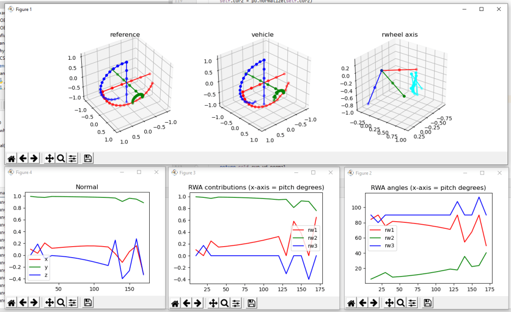 10:00 Meeting with Vadim. Went over the code and found that the angle calculation only works properly between two unit (vectors of the same length?). That fixed the contribution problems I was having. So that’s one serious bug fixed. Vadim is going to look at folding in the changes, and I’m going to work on getting this to work with the six reaction wheel version.