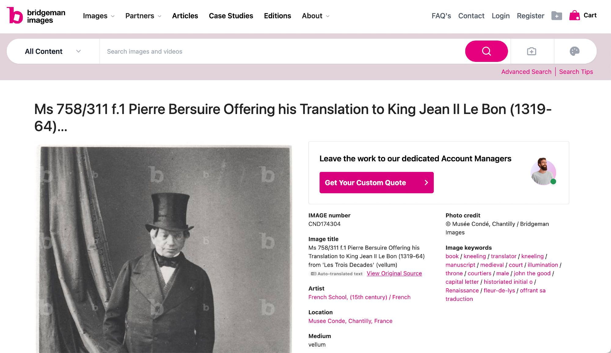 The alt text describes “Screenshot of a Bridgeman Images page, which shows what appears to be a 19th-century photograph of a man in a top hat, but which has appended metadata for a completely different work of art, namely, a late medieval manuscript, which features an image of the author Pierre Bersuire presenting his book to the King of France.