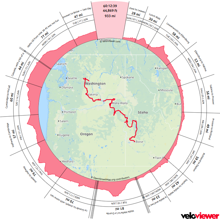 Back from the bike trip! Wenatchee to Boise – 930 miles, 45k feet of climbing. Started a bit out of shape but found some form. I’m a lot slower than when I did this in 2012!